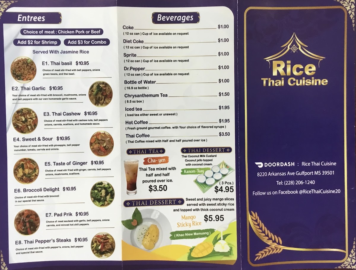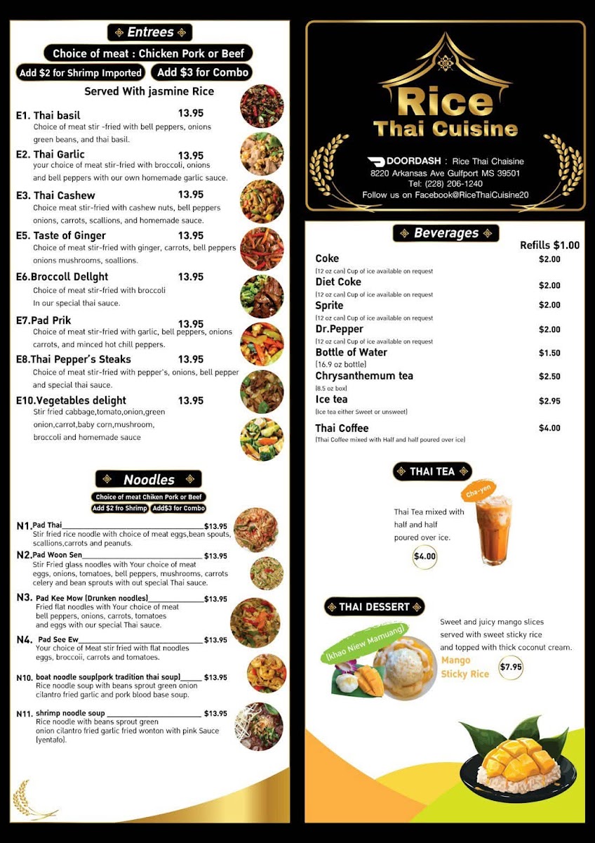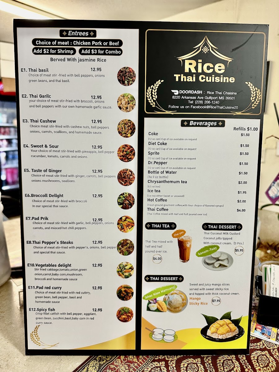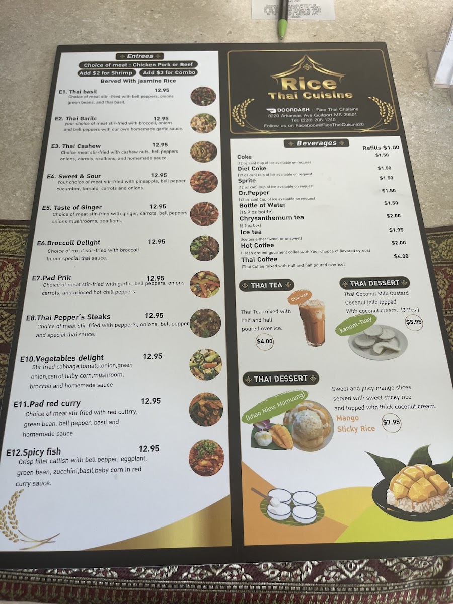 For beverages, Rice Thai Cuisine serves refreshing drinks like Coke, Diet Coke, Sprite, and Dr. Pepper, along with bottles of water to complete your meal.