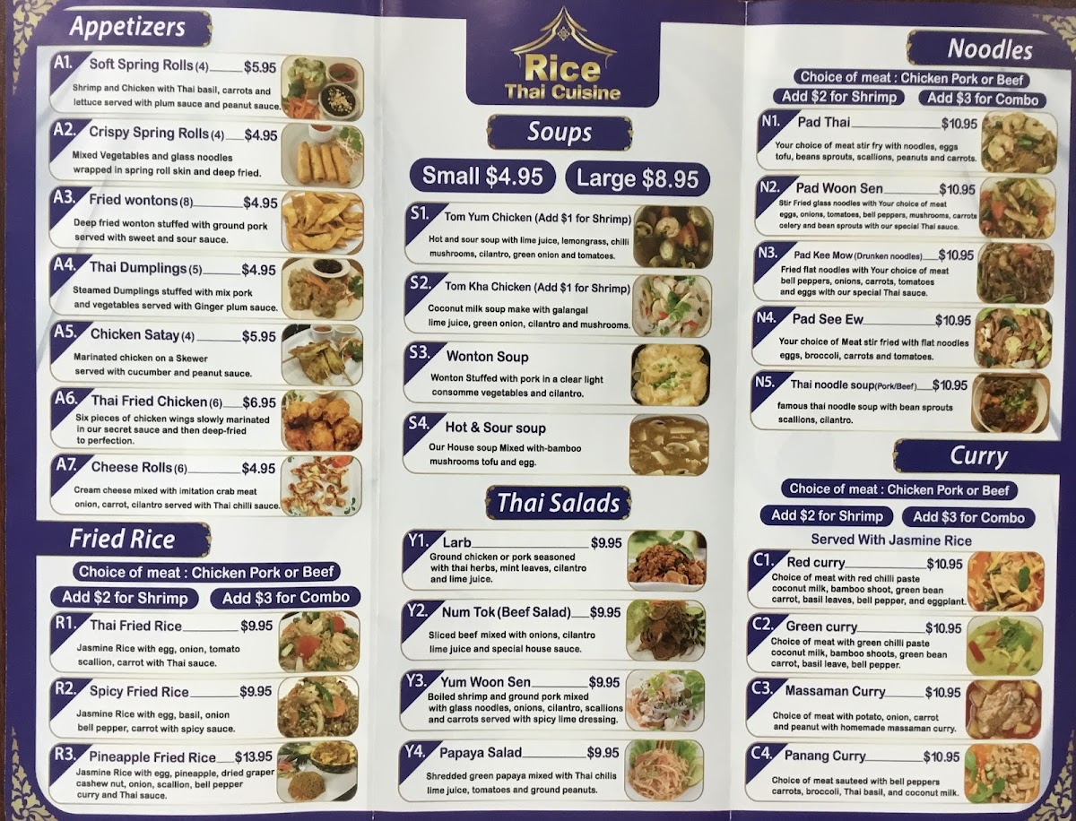 If you're in the mood for curry, Rice Thai Cuisine has you covered with their array of curry dishes served with Jasmine rice. The C1 Red Curry, C2 Green Curry, and C3 Massaman Curry are especially favored, and you can add shrimp for $2 or a combo of meats for an extra $3.