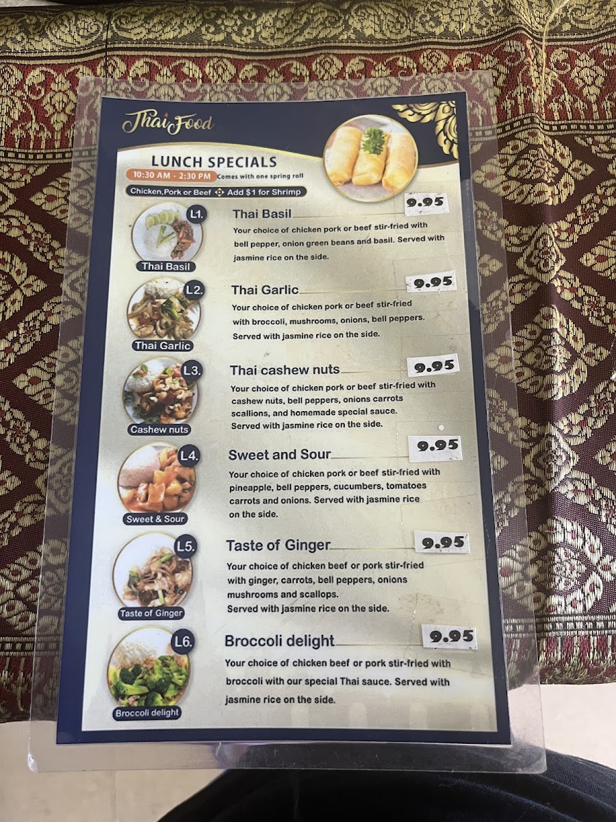 Rice Thai Cuisine in Gulfport offers a diverse and flavorful menu with options to suit every taste. Their Lunch Menu is served from 11:30 AM to 2:30 PM, Monday and Wednesday to Friday, and includes a crispy spring roll with each entrée. For just an additional $1, you can substitute shrimp for your choice of meat. Some popular lunch options include the L1 Thai Basil, L2 Thai Garlic, L3 Thai Cashew Nut, and the L5 Taste of Ginger-all offering a delightful balance of fresh ingredients and traditional Thai flavors.